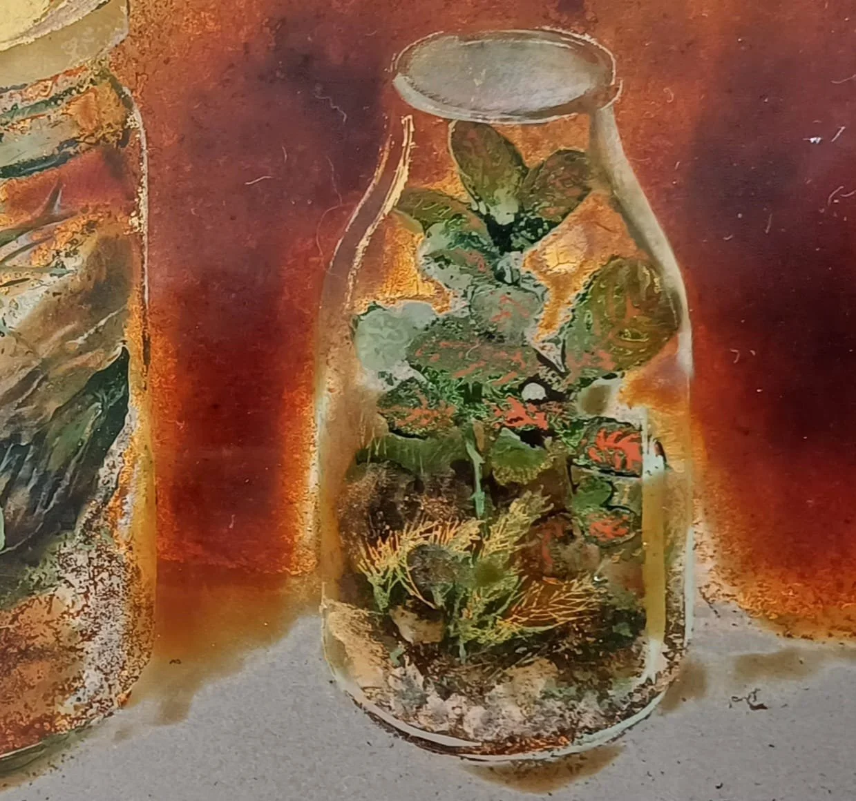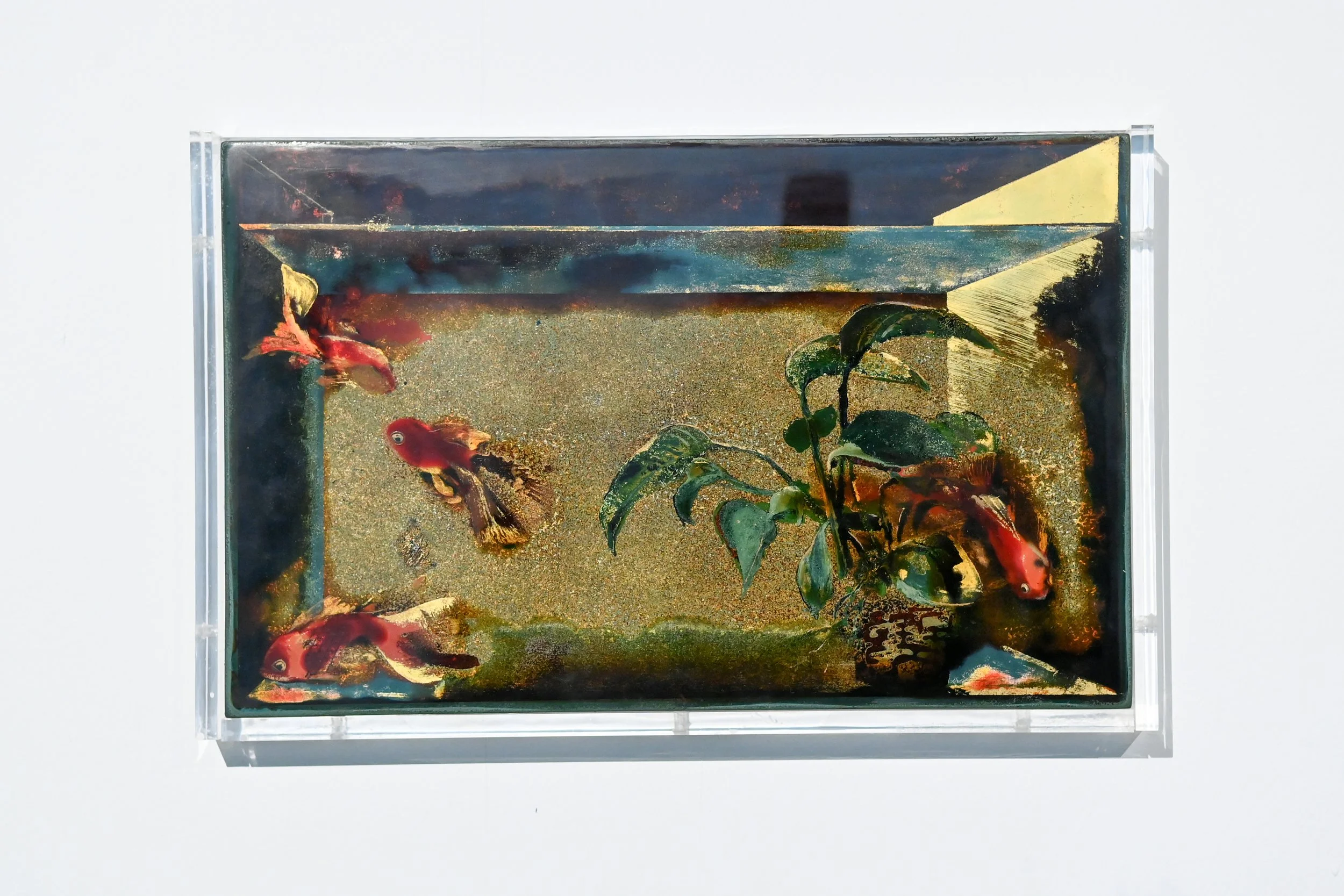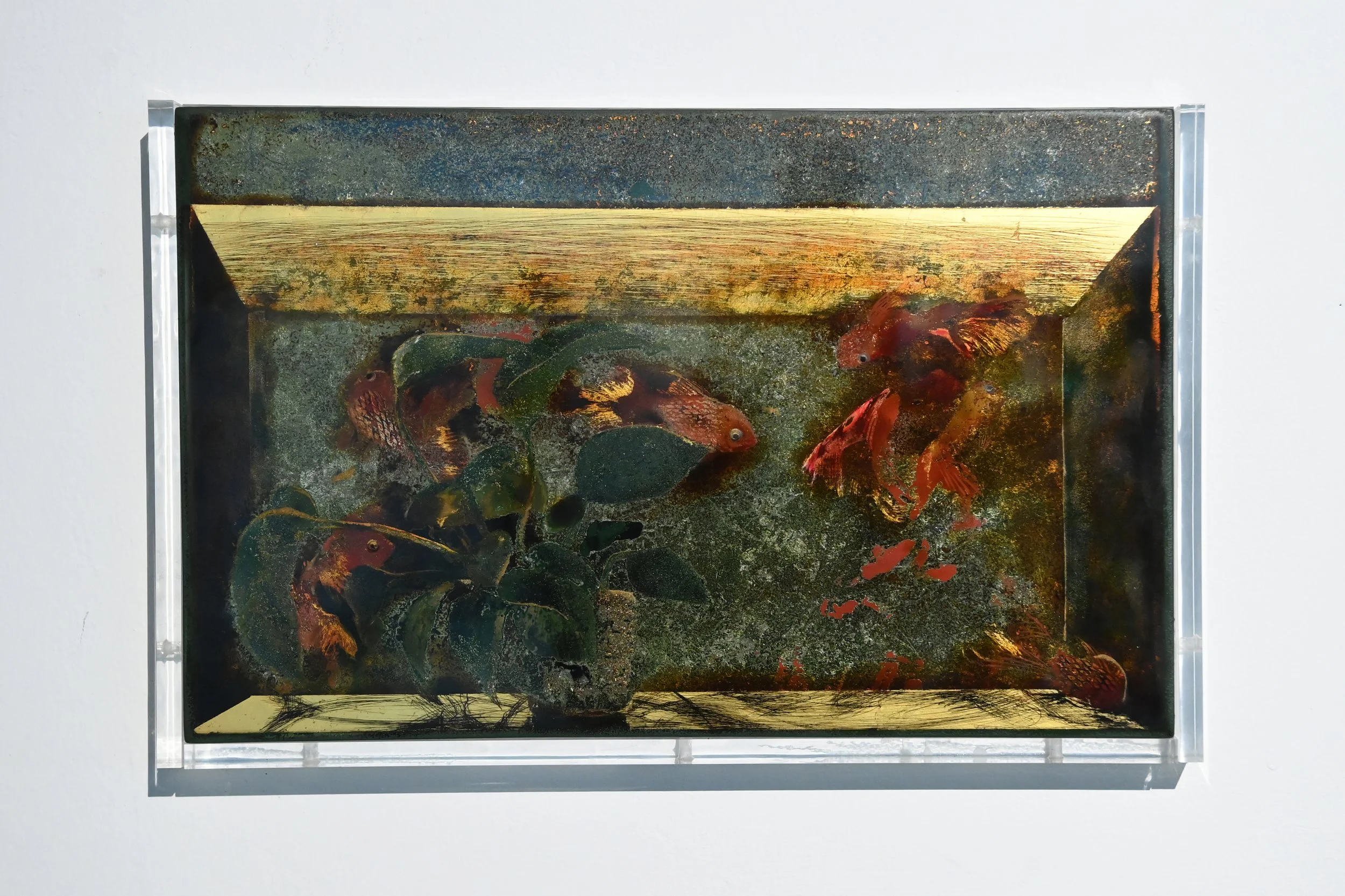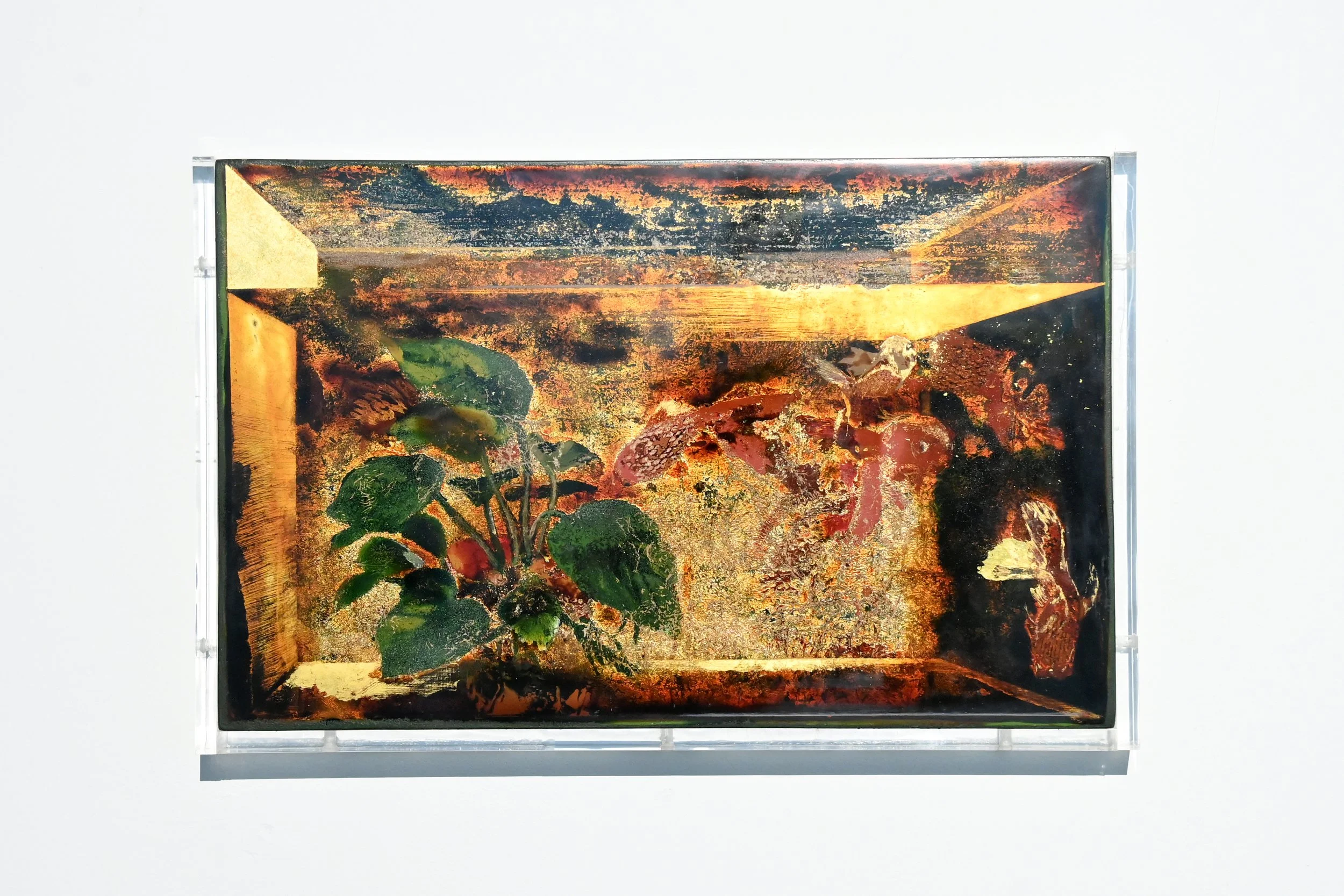 “Vivarium” is a series of lacquer paintings about life observed behind glass. They are still life paintings representing terrarium jars, paludariums, or aquariums, depicting entire habitats and micro landscapes within glass enclosures.