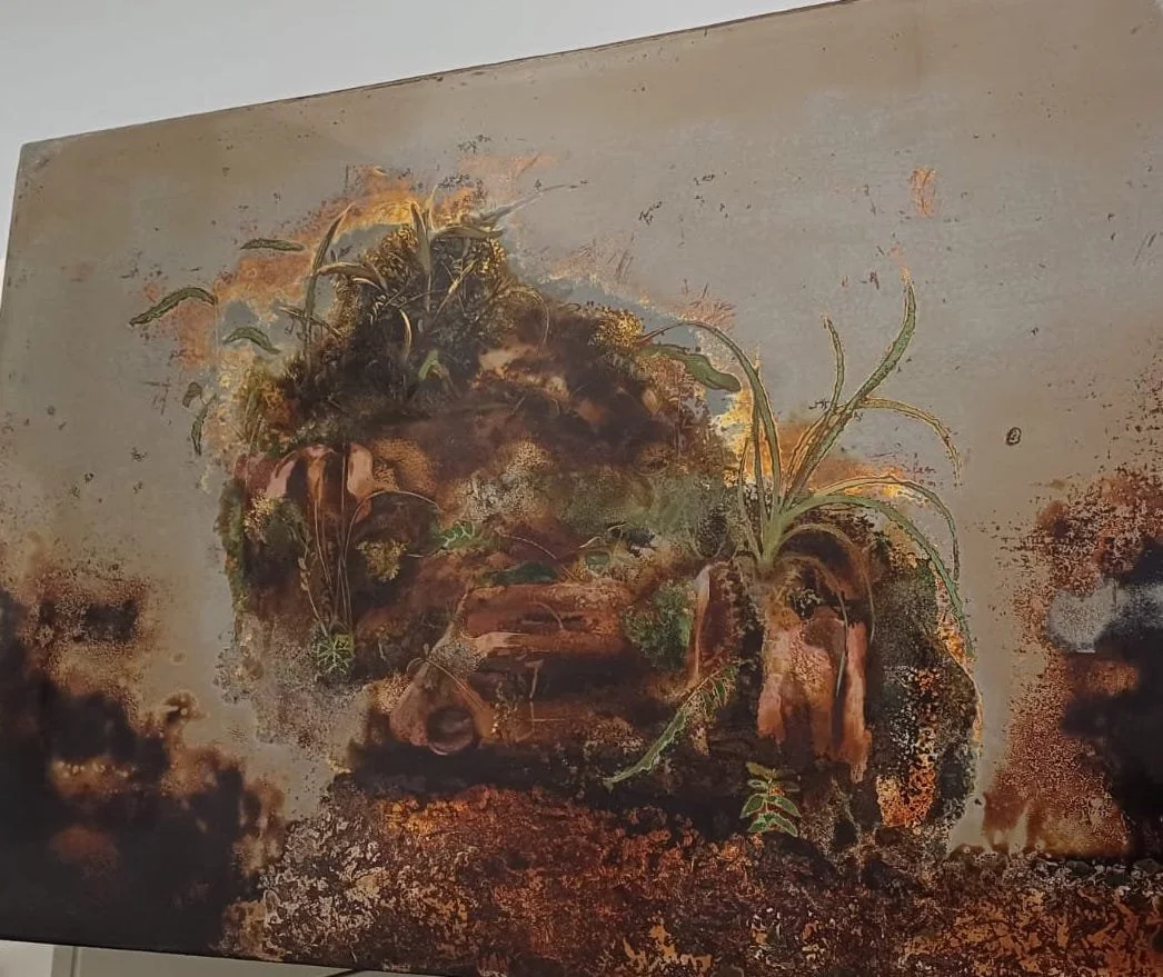 In terms of the medium, here I have tried to explore a type of naturalism in Tranh sơn mài lacquer painting based on repeated direct observation over many days and layers then sanding away like erosion. It is a process that reflects the passage of time as well as fossilizes and preserves these mental and visceral experiences. This continuous material accumulation and subtraction leads to an image of the observed that seems to exist at different moments and times. While not tonally realistic like a photograph, this lacquer realism is more involved with the slippery ever changing experience of sight and of memory...which I consider to be Tranh sơn mài's most interesting potential contribution to the field of painting.