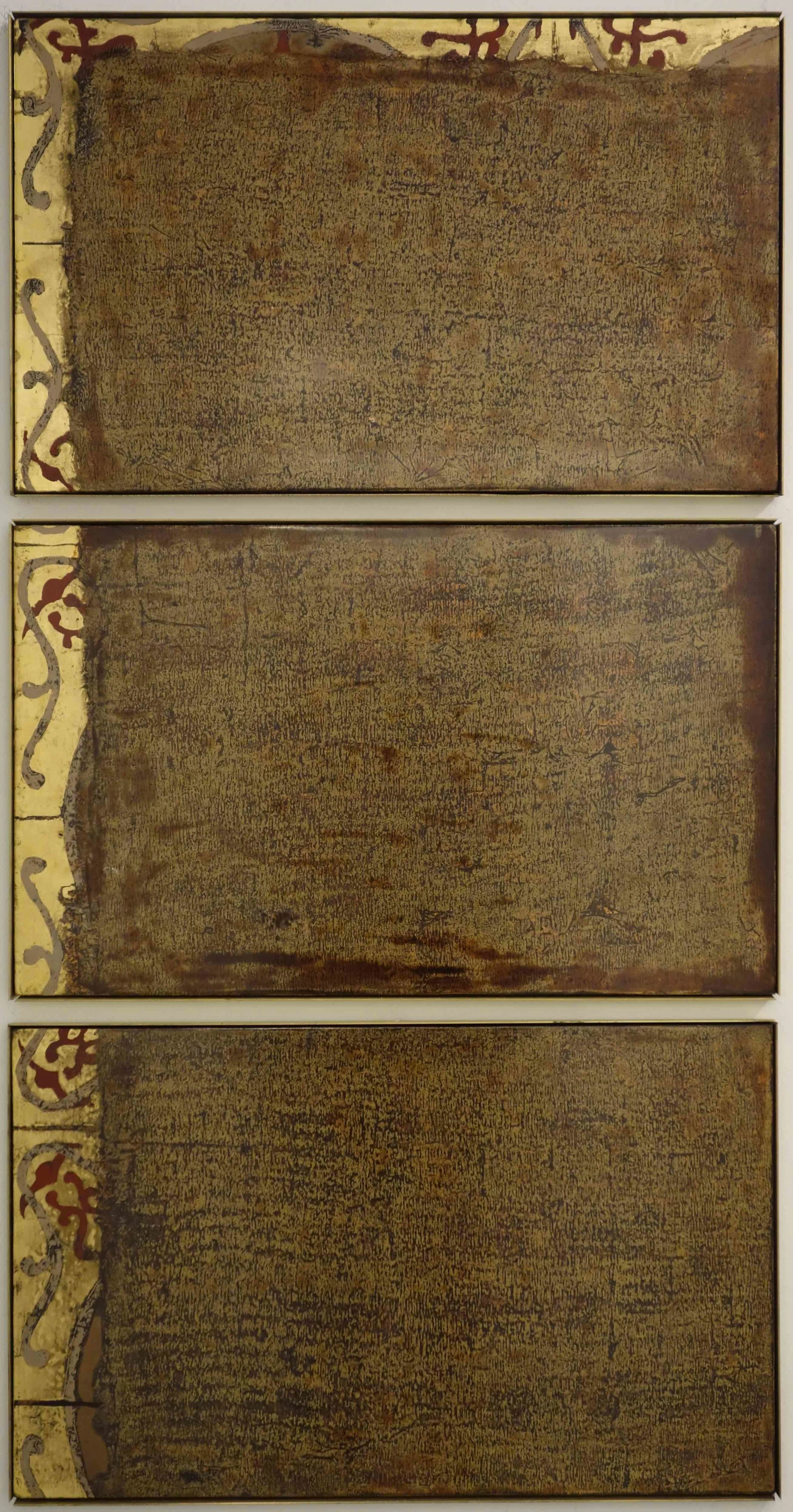 The straw mat is like a symbolic hearth in Vietnamese society, the place around which the family gathers for daily meals, weddings, death anniversaries, naps. Upon it, day after day from repeated use, the sweat and the weight of the body is imprinted. This triptych is not only a representational image of a worn and battered straw mat, but rather it is like a physical fossil of its existence. Vietnamese natural lacquer (son ta) lacquer here becomes the ground onto which the history of the object is physically imprinted and graphically recorded. The texture of the mat at a distance looks like some lost ancient script. In her work, Phi Phi explores lacquer painting not only as a medium, but as a material signifier of the history ideological changes in Vietnam.